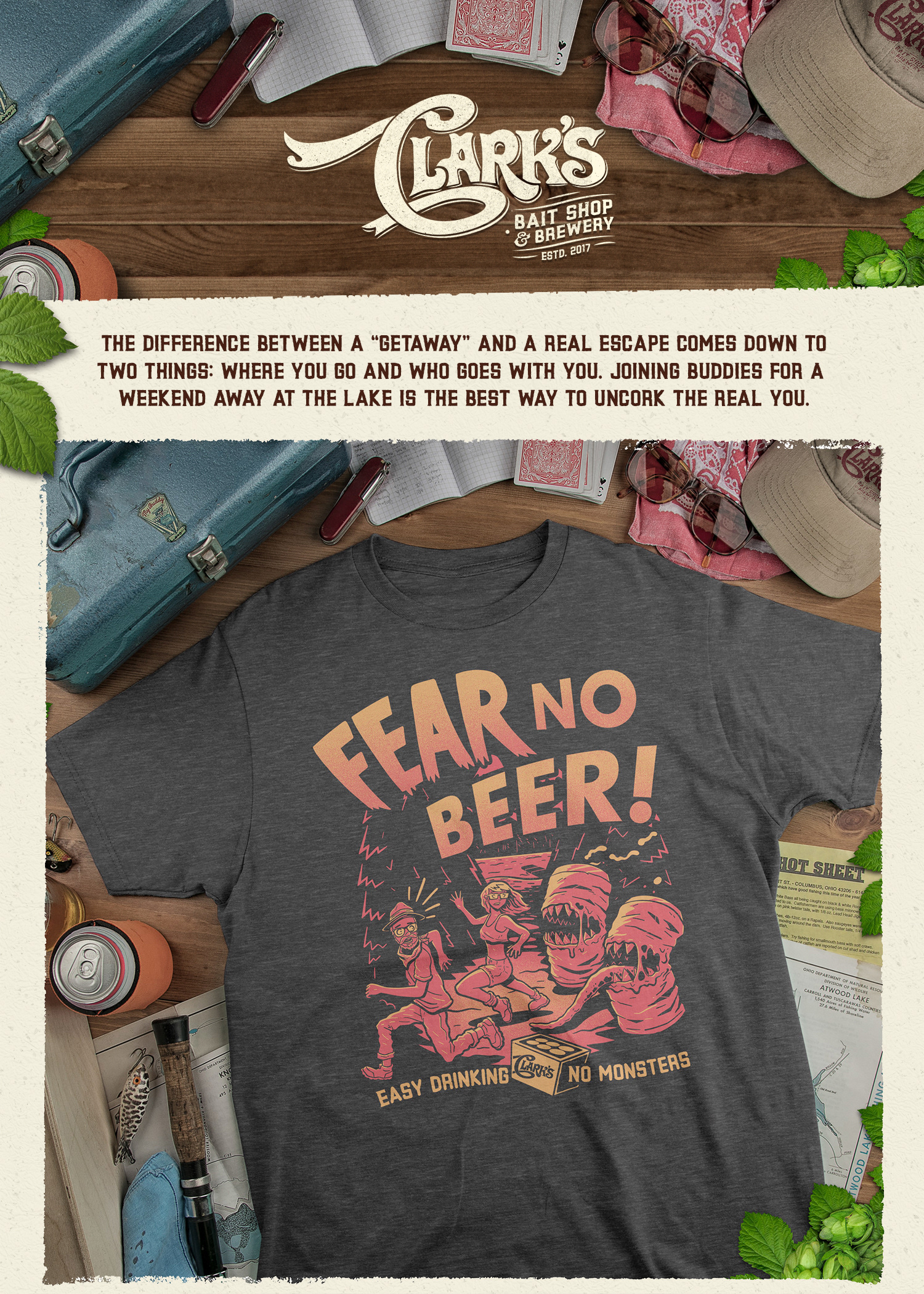 Lake loving Junkies like Clark long for the ease and relaxation that comes with fresh air and good friends. It’s the relaxed say-anything, wear-anything vibe that happens naturally after an active day on the water. A carefree afternoon of fishing followed by a few cold cans an evening sway in the hammock.