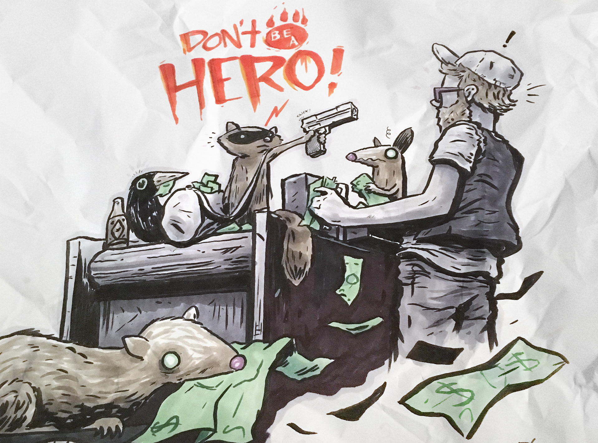 "On the quest for money, power, respect, shiny objects, bottle caps and bread crusts."