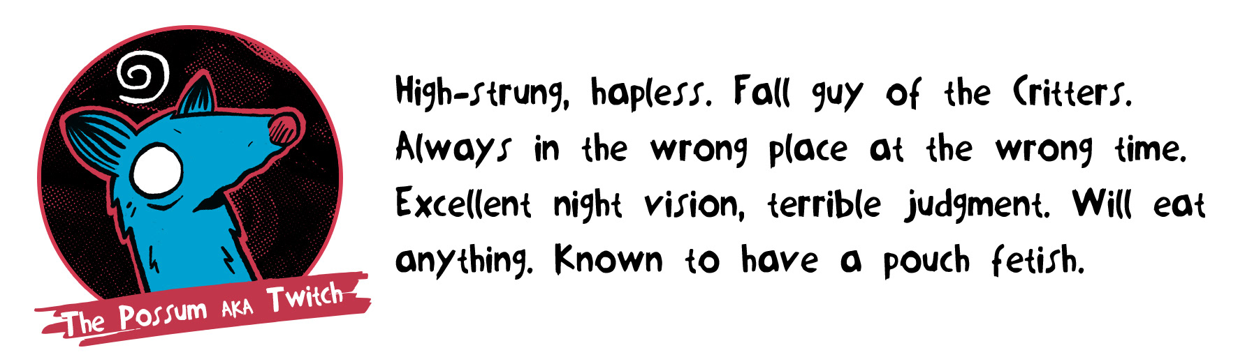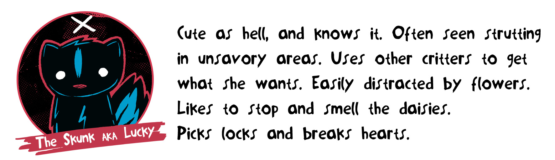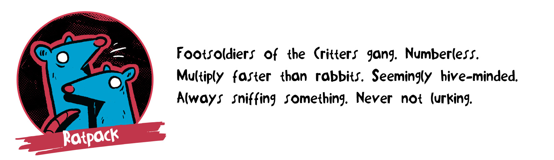 A pack of woodland critters turned street toughs. Always on the run, going city to city looking the next come up. Whether they're roaming down alleys, lurking in the sewers or hiding in their trash can safe houses, the Critter Gang are always waiting for their chance to jack your loot when you least expect it.
